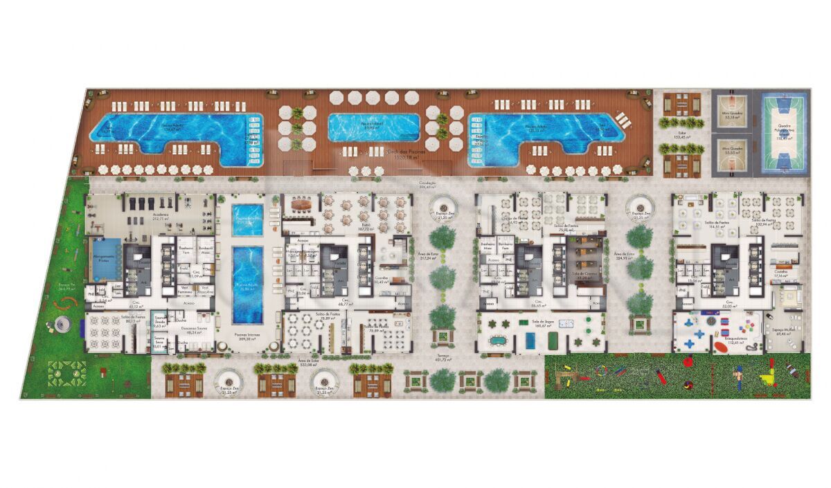 Piscinas externas adulto e infantil com espelho d'água