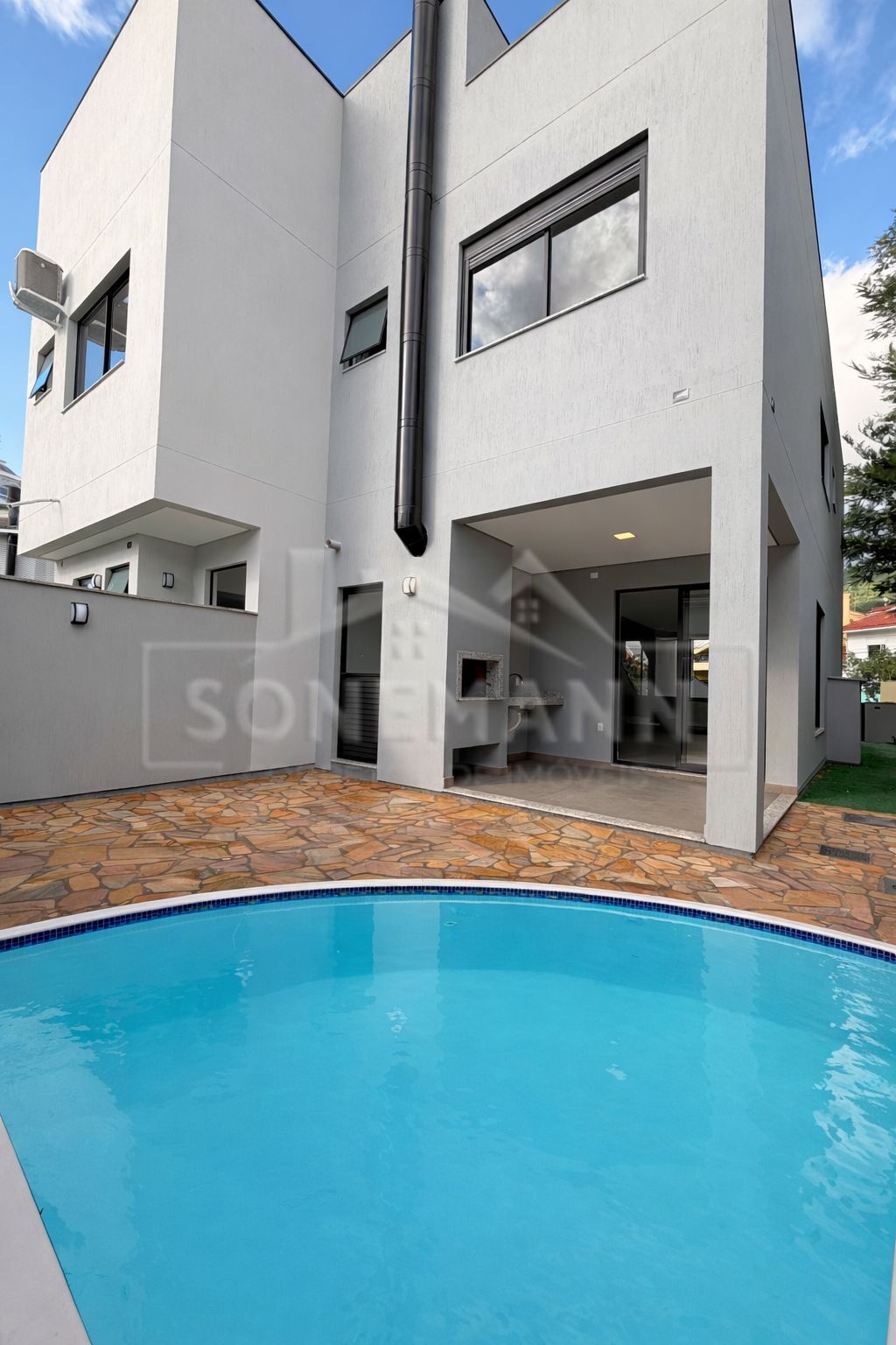 Com dois pavimentos, três suítes, lavabo, cozinha americana, área de serviço separada, piscina, churrasqueira, 02 vagas.